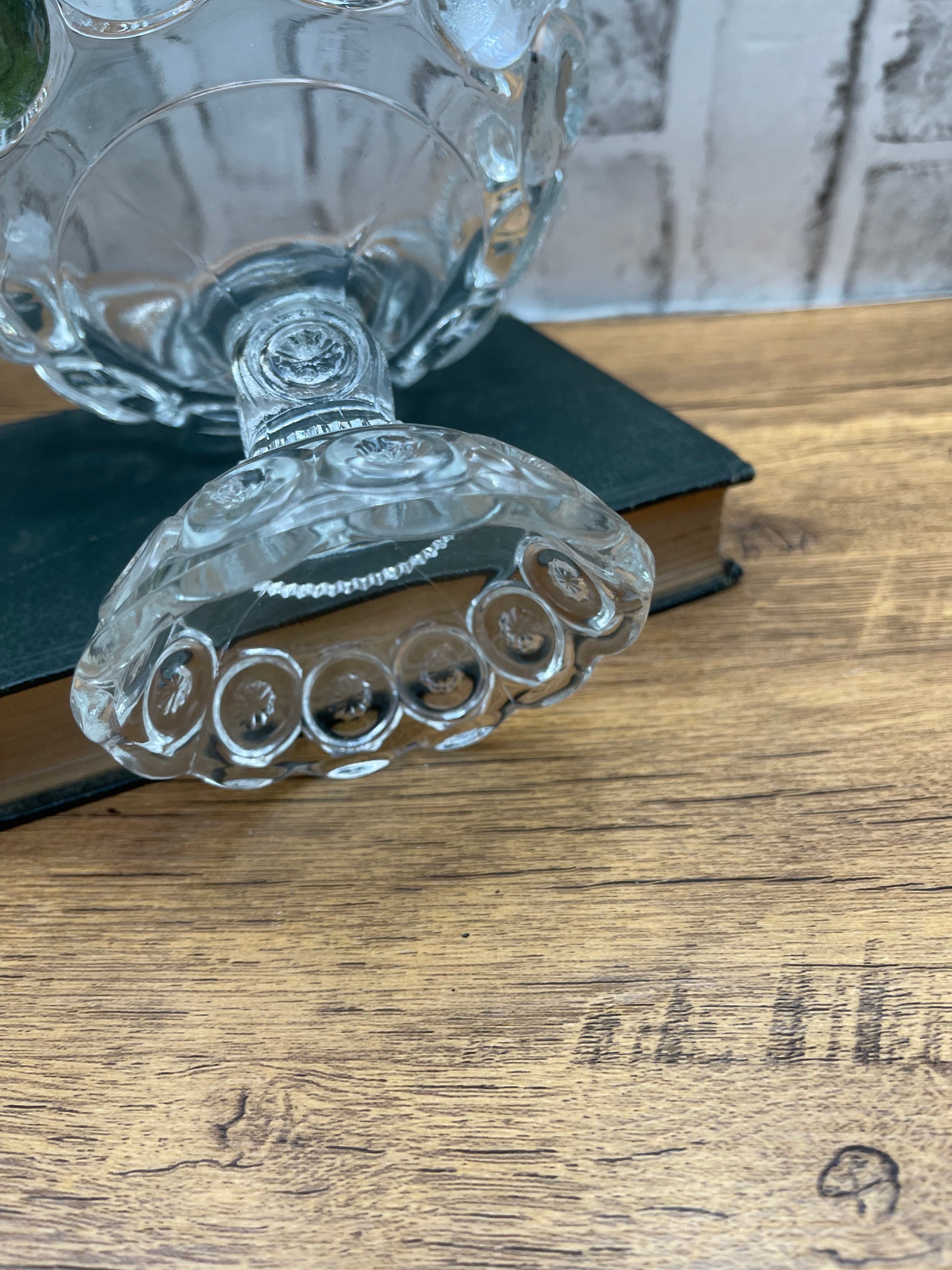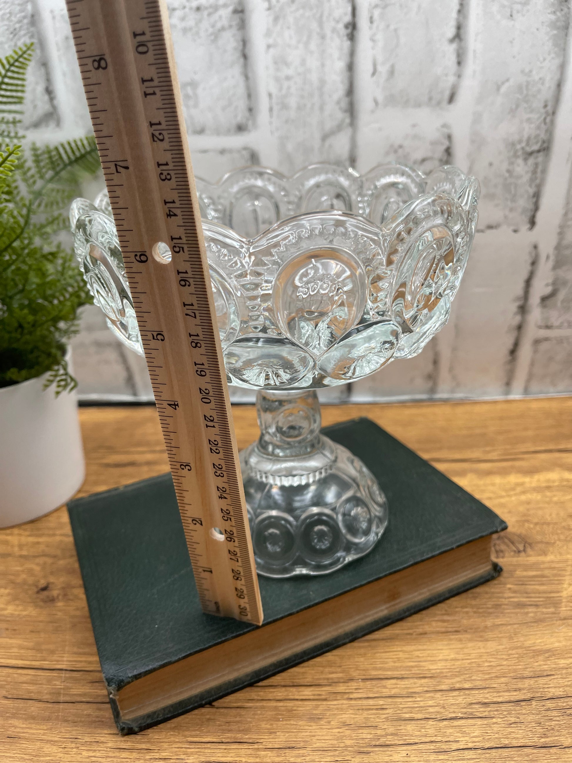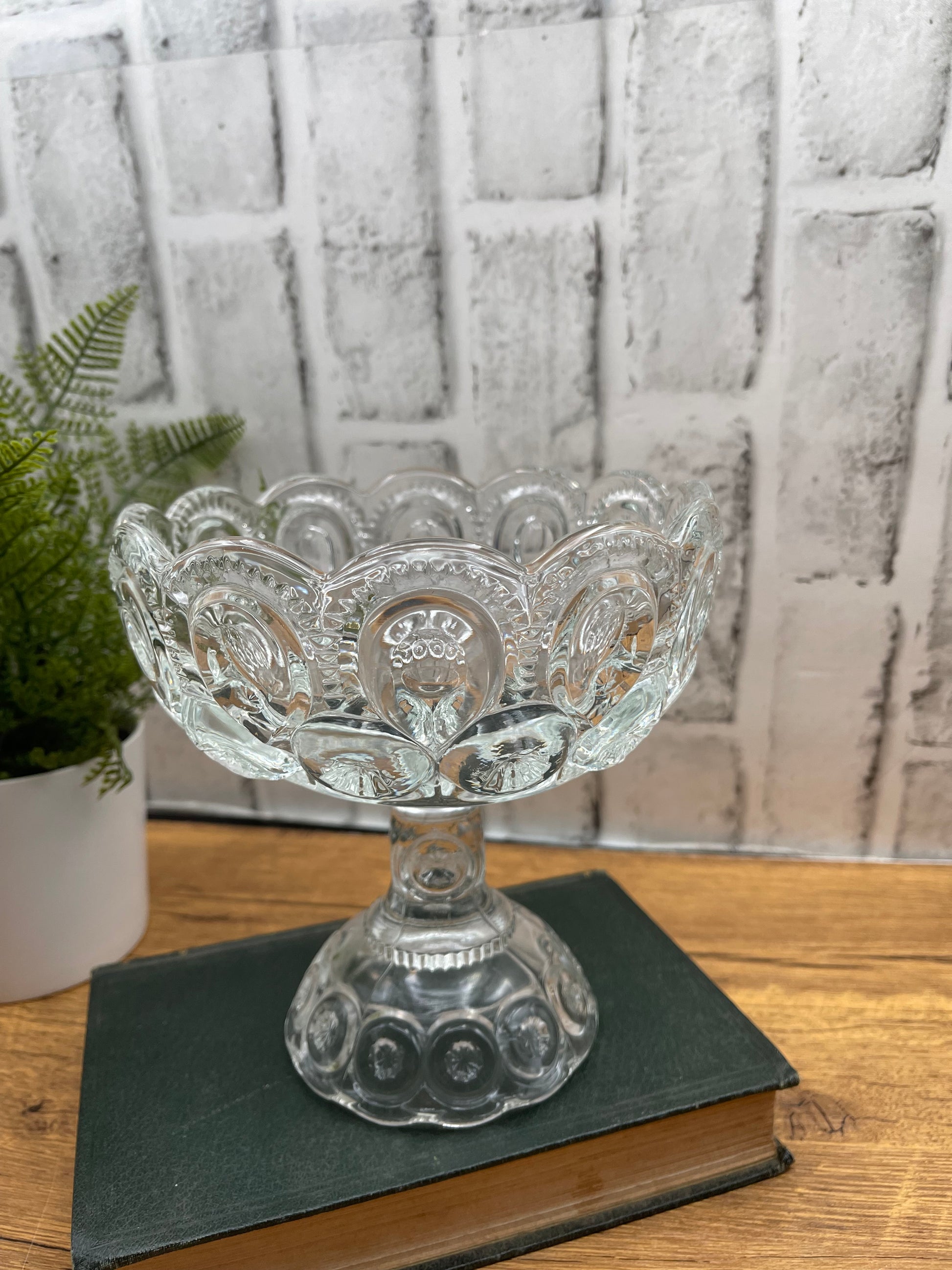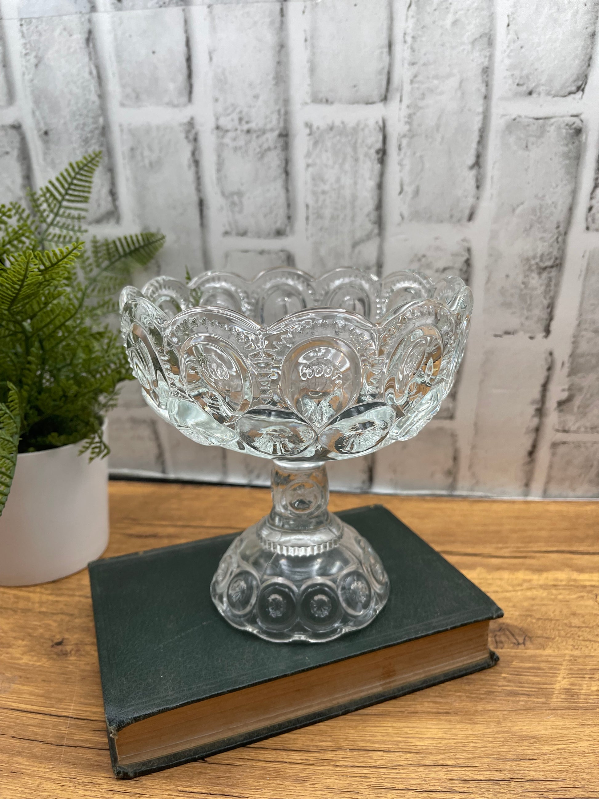 Add a touch of retro charm to your home decor with this LE Smith Compote Moon & Stars clear glass footed vintage candy dish.