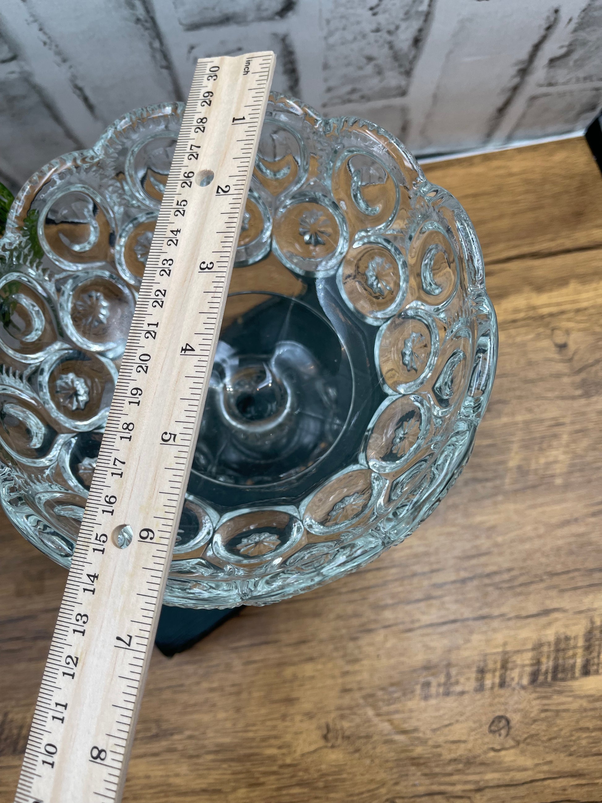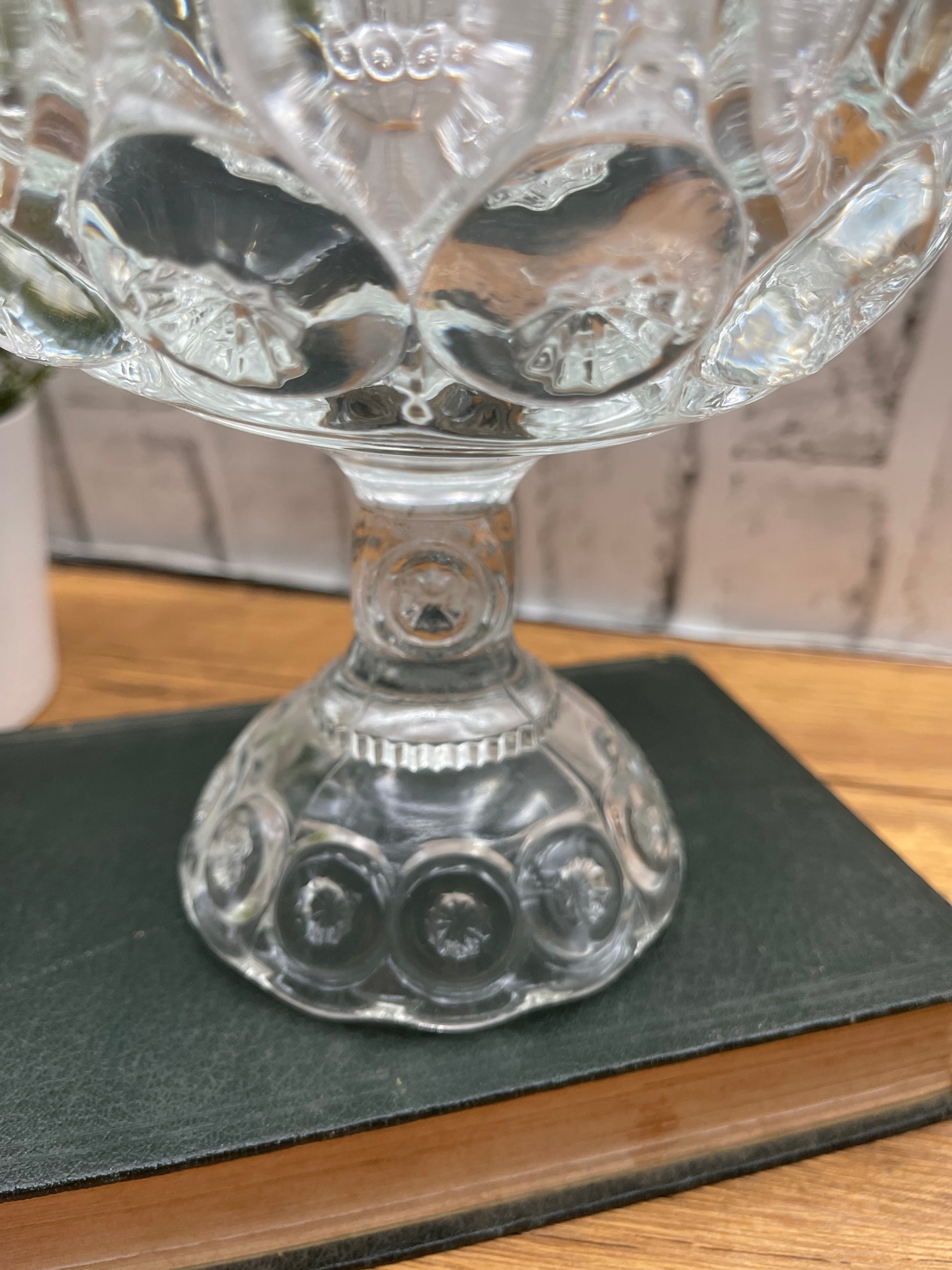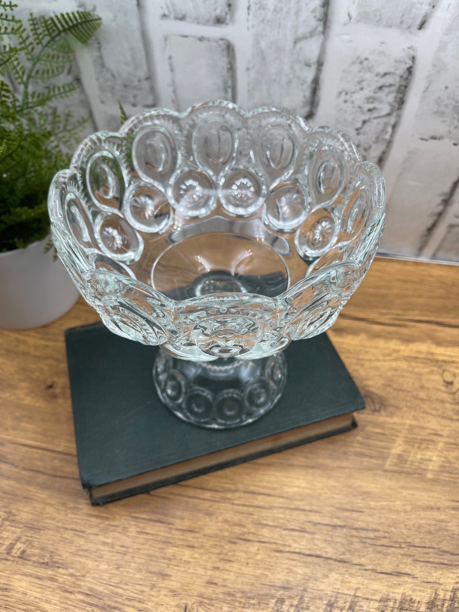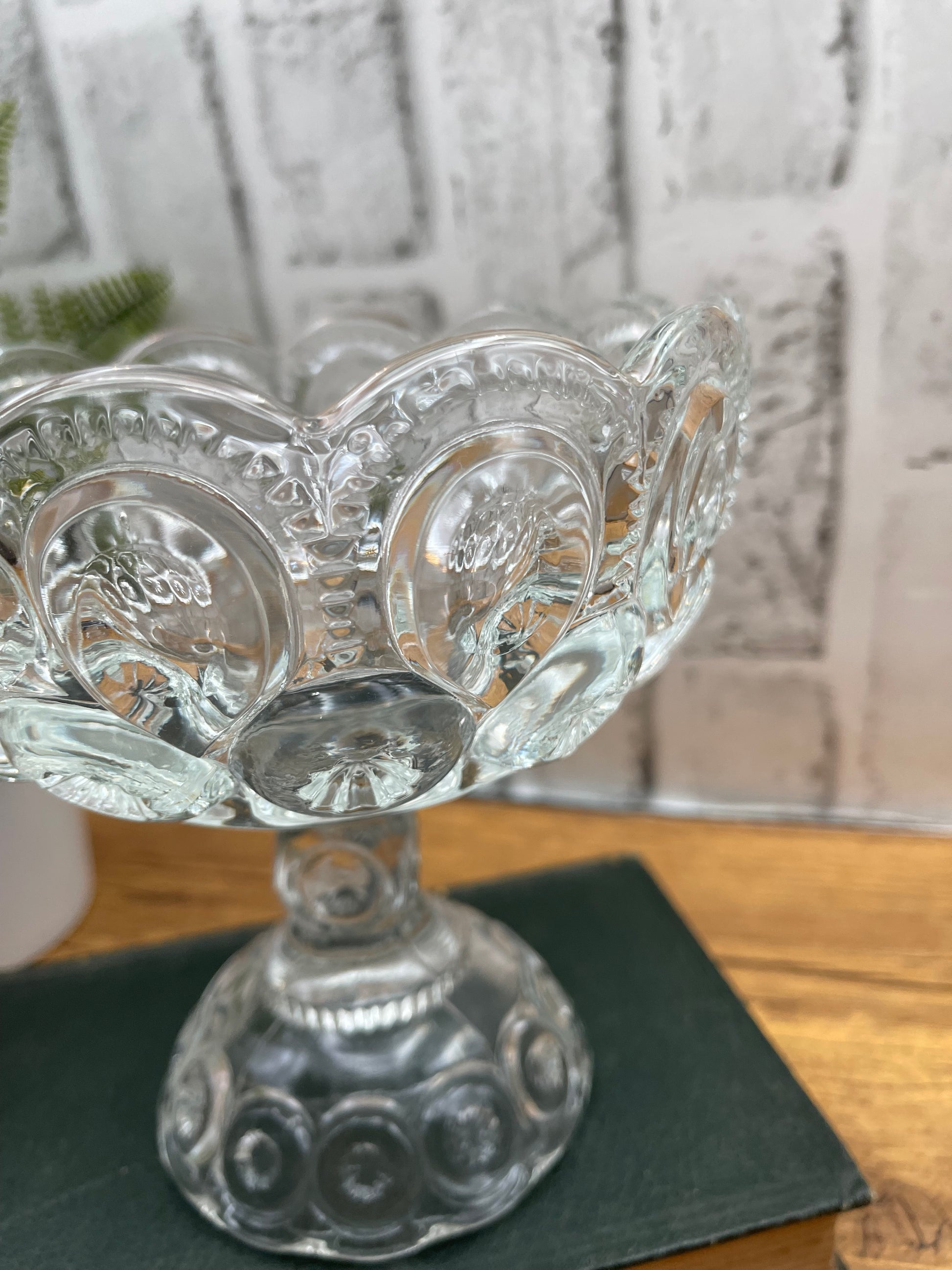 Add a touch of retro charm to your home decor with this LE Smith Compote Moon & Stars clear glass footed vintage candy dish.
